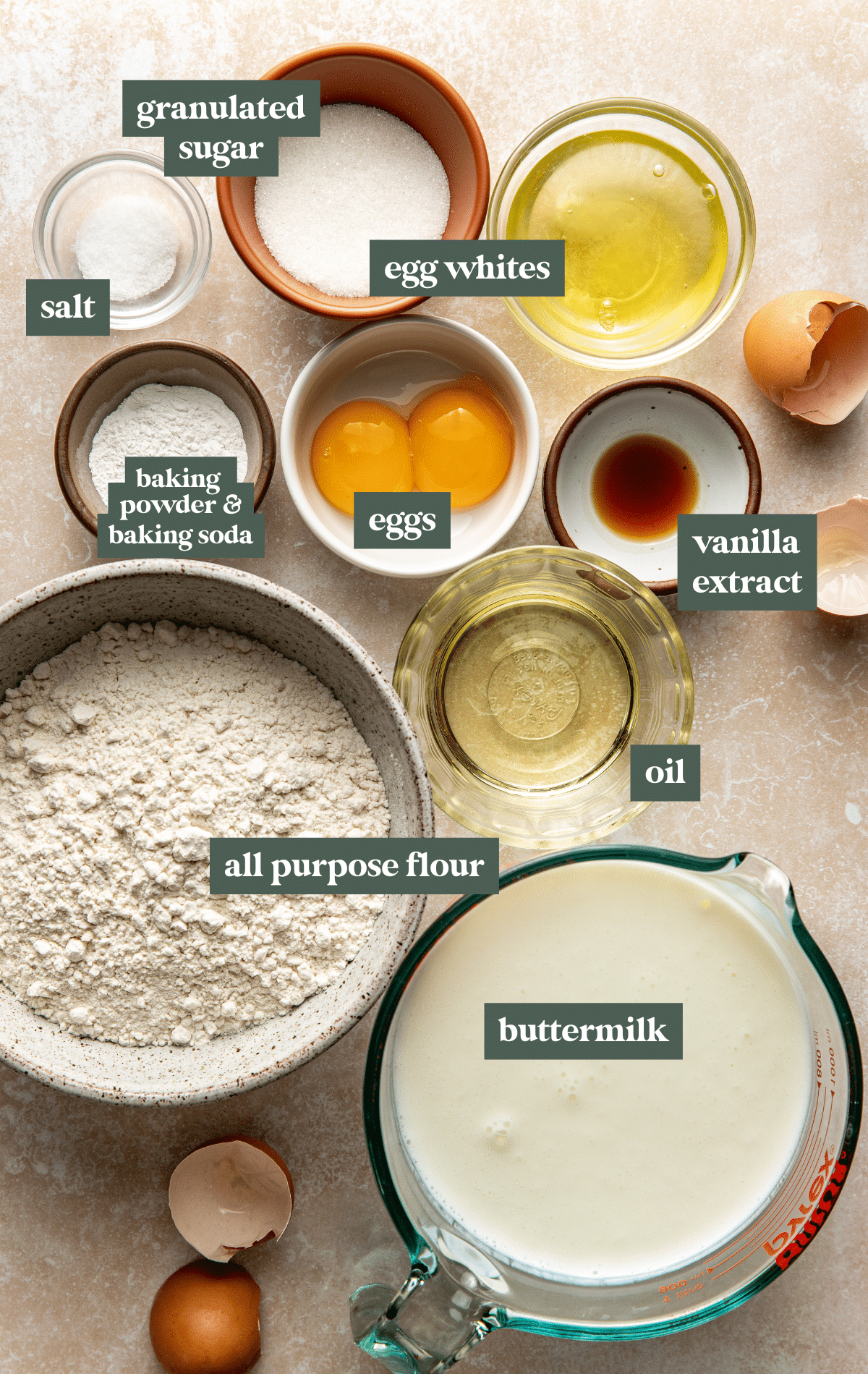 - Whisk wet ingredients: In a large bowl, gently whisk all liquid ingredients: egg yolks (reserve the egg whites and set them to the side), buttermilk, vegetable oil, and vanilla extract. 2 large eggs, room temperature, 2 1/2 cups buttermilk, 1/4 cup vegetable oil, 1 tsp. vanilla extract