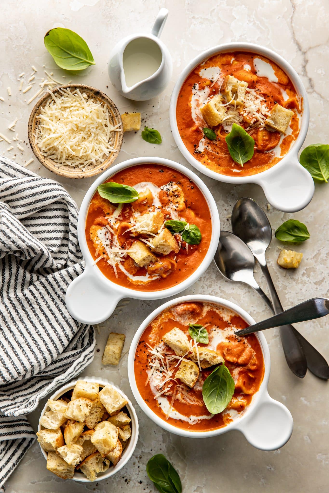 <img loading=“lazy” src=“https://krollskorner.com/wp-content/uploads/2020/10/Tomato-Tortellini-Soup_HighRes-010-scaled.jpg" onerror=“this.onerror=null;this.src=‘https://blogger.googleusercontent.com/img/a/AVvXsEhe7F7TRXHtjiKvHb5vS7DmnxvpHiDyoYyYvm1nHB3Qp2_w3BnM6A2eq4v7FYxCC9bfZt3a9vIMtAYEKUiaDQbHMg-ViyGmRIj39MLp0bGFfgfYw1Dc9q_H-T0wiTm3l0Uq42dETrN9eC8aGJ9_IORZsxST1AcLR7np1koOfcc7tnHa4S8Mwz_xD9d0=s16000';" alt=“Overhead view of three white bowls filled with creamy tomato tortellini soup, topped with croutons, parmesan, fresh basil, and a drizzle of cream, surrounded by serving spoons and garnishes.