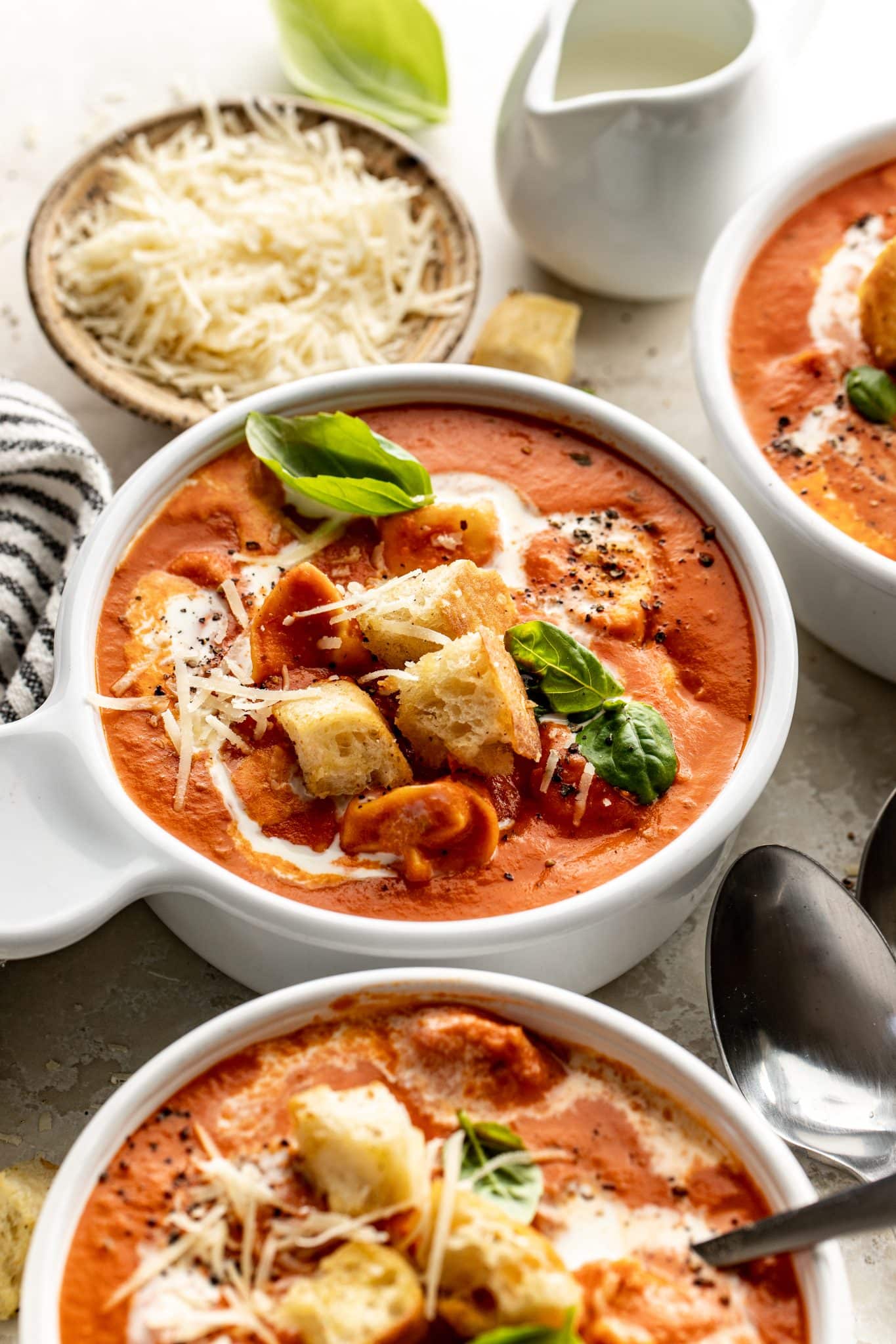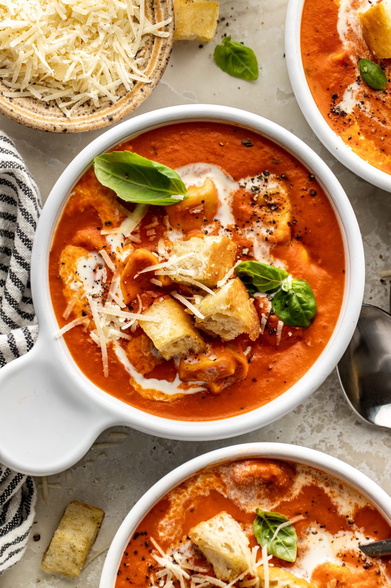 <img loading=“lazy” src=“https://krollskorner.com/wp-content/uploads/2020/10/Tomato-Tortellini-Soup_HighRes-014-scaled.jpg" onerror=“this.onerror=null;this.src=‘https://blogger.googleusercontent.com/img/a/AVvXsEhe7F7TRXHtjiKvHb5vS7DmnxvpHiDyoYyYvm1nHB3Qp2_w3BnM6A2eq4v7FYxCC9bfZt3a9vIMtAYEKUiaDQbHMg-ViyGmRIj39MLp0bGFfgfYw1Dc9q_H-T0wiTm3l0Uq42dETrN9eC8aGJ9_IORZsxST1AcLR7np1koOfcc7tnHa4S8Mwz_xD9d0=s16000';" alt=“Close-up overhead of tomato tortellini soup in white bowls, garnished with basil, croutons, grated parmesan, and a swirl of cream, next to a small bowl of shredded cheese and striped napkin.